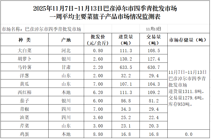 2025年11月7日-11月13日巴彦淖尔市四季青批发市场一周平均主要菜篮子产品市场情况监测表