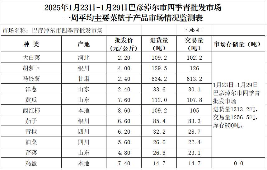 2026年1月23日-1月29日巴彦淖尔市四季青批发市场一周平均主要菜篮子产品市场情况监测表