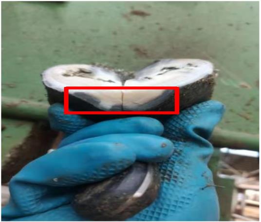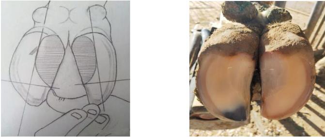 第3步挖蹄弓。保留蹄尖部的三角区范围不动,在牛蹄底面做出一个桃心型的蹄弓,占蹄底面积的1/3。一个好的蹄弓能有效地减少地面对牛蹄的反压力,减少蹄底溃疡的发生。做好以上三步保健性修蹄就完成了。