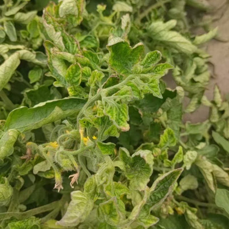 1.植株受害:番茄叶片出现花叶、深绿突起、狭窄卷曲,叶脉黄化甚至坏死;番茄植株发育迟缓,叶片褶皱有黄色斑驳。花量减少,果梗易坏死,整体长势衰弱。