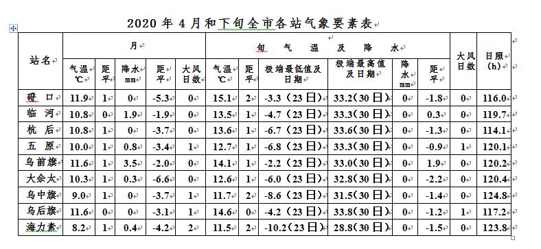概 况:4月平均气温临河和乌后旗与常年持平,其余地区比常年偏高1℃,前山地区10.0~11.9℃,后山地区8.2~9.0℃。4月全市降水偏少,磴口、杭后、乌中旗和乌后旗无降水,其余地区降水量0.3~3.5毫米,比常年偏少1.9~6.6毫米。月内海力素有2天大风,五原、乌中旗和乌后旗分别有1天,其余地区无大风。全市九个国家级气象站月日照时数均值312.1小时,比常年多28.8小时;其中,套区309.0小时,比常年多24.9小时。