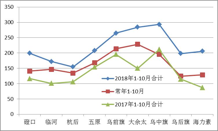 从下表可以看出, 全市1~10月降水总量154.5~293.1毫米,比常年偏多20.2~97.9毫米,比2017年偏多48.5~134.5毫米。套区平均降水量199.6毫米,比常年多39.0毫米,比2017年多65.3毫米;牧区平均降水量249.4毫米,比常年多87.4毫米,比2017年多100.2毫米;山旱区降水量284.2毫米,比常年多56.0毫米,比2017年多134.5毫米。
