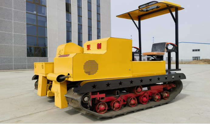 履带自走式沙障机主要由动力系统、柴油机、减速机、转向手柄、压草碾轮、履带、承重行走轮、座椅、扶手、遮阳棚、配重箱等组成。