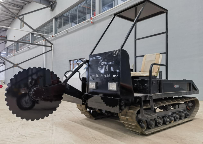 履带自走式沙障机,碾压深度为15-30cm,配备汽油增程发电机电动驱动(实现边作业边充电,为连续作业提供续航保障),配置履带式底盘,适用于40度以内的沙坡,液压推杆控制碾轮升降,提高下压能力,加装弹簧座椅、扶手、遮阳棚,一机一人一遥控,转向灵活,操作简单便捷,省时省力。