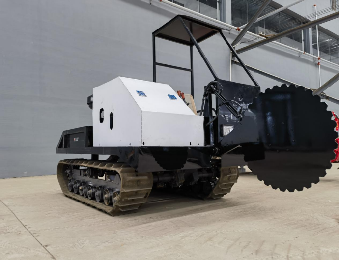 履带自走式沙障机主要由动力系统、电机、控制器、减速机、电池组、电子液压泵、压草碾轮、履带、承重行走轮、座椅、扶手、遮阳棚、配重箱等组成。