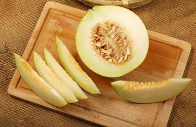 河套蜜瓜果实为高圆形,成熟时果皮呈金黄色,果面光滑略带环纹,果柄处略突起,果肉淡绿色、白色、黄红色,肉质细软,汁多,口感甜,可溶性固形物含量14.0%以上,有独特浓郁芳香。纤维少而细,果实总维生素C含量25.6~31.8mg/100g,可溶性总糖8.01%~10.11%,可溶性固形物11.2%~14.5%,钾252.06~266.16mg/100g,钙65.00~78.10mg/kg,铁4.12~6.24mg/kg。