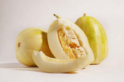 果形端正,呈纺锤,果皮光滑,着色均匀,皮薄肉厚,果皮呈灰绿色,果肉外层绿色,内层为橘色;成熟时黄白色,果肩有轻微绿晕。果肉白色、瓤黄色,瓜瓤含水较少,果肉与瓜瓤易于分离;口感甜脆,浓香味。含糖量18%,蛋白质0.4%,碳水化合物6.2%,100g甜瓜瓤内含钙29 mg、胡萝卜素0.03 mg、硫铵素0.02mg、抗坏血酸13mg,还含有可以将不溶性蛋白质转变成可溶性蛋白质的转化酶;甜瓜含脂肪油27%,其中有亚油酸、油酸、棕榈酸、甘油酸、卵磷脂等;含球蛋白及谷蛋白约5.78%,含乳糖、葡萄糖、树胶、树脂等;瓜蒂含甜瓜素及葫芦素B、E等结晶性苦味质。