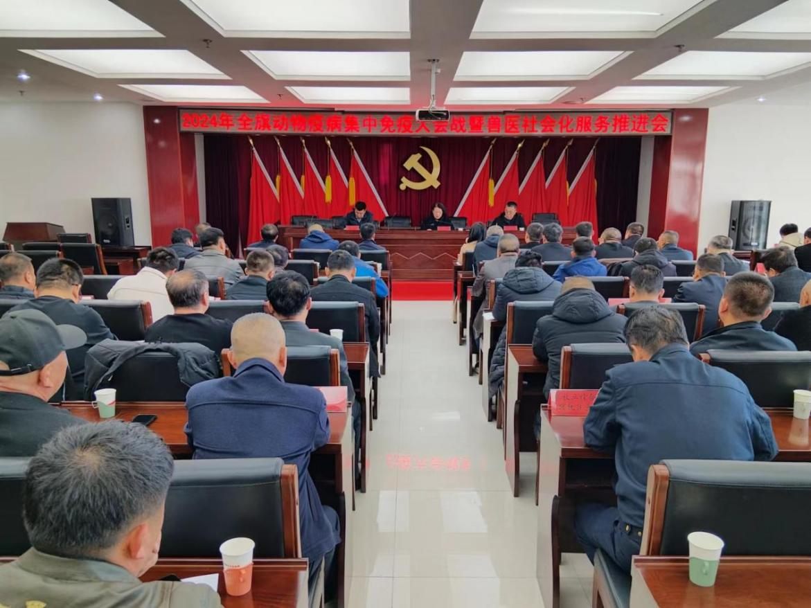 首先,旗农科局局长杨拥军对当前各类动物疫病在国际、国内的流行态势、造成的危害及可能对我旗畜牧业健康发展造成的影响全面分析。对2024年度动物疫病(春、秋)防控的时间、强制和计划免疫的病种、疫苗及防控物资的保障、流调消毒、免疫抗体检测、防控宣传、兽医社会化服务“防疫+诊疗”的实施、“先打后补”的开展流程要求、防疫督查指导、防疫考核等各项工作进行全面安排部署。要求三方公司对防控工作必须坚持“镇不漏村、村不漏户、户不漏畜、畜不漏针、针不漏药”的工作总要求,以促进免疫效果的全面提升。