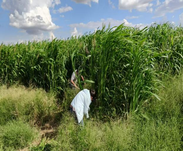 乌拉特中旗肉羊技术服务团队深入农科院巴音哈太基地种植的高丹草实验地开展测产示范工作