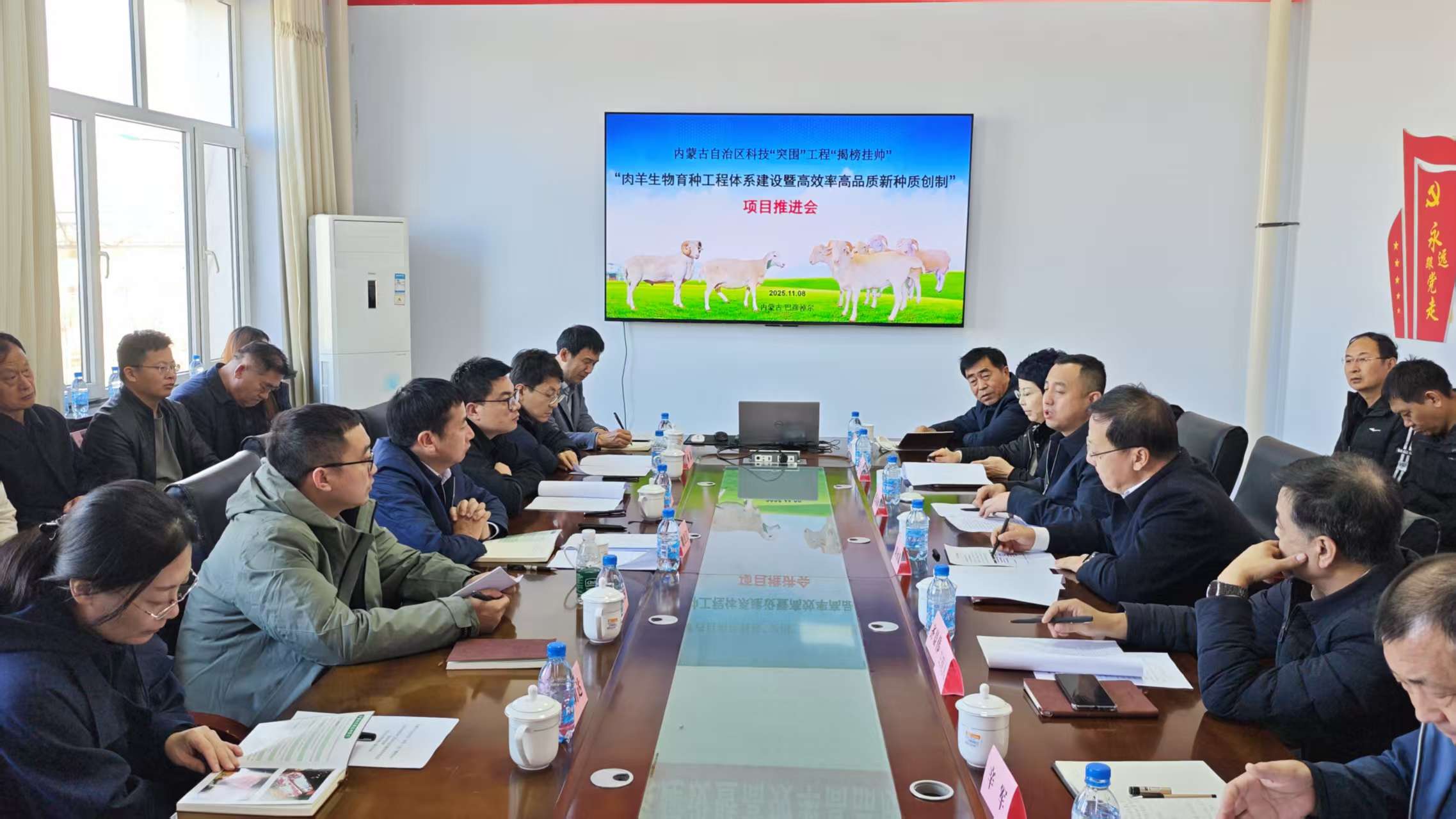 为全面推动内蒙古自治区科技“突围”工程“揭榜挂帅”项目“肉羊生物育种工程体系建设暨高效率高品质新种质创制”实施,11月8日,在内蒙古富川养殖科技股份有限公司召开了项目推进会,会议由内蒙古农业大学主办,富川养殖公司、巴彦淖尔市农牧业科学研究所和肉羊技术创新中心承办。会议邀请云南农业大学副校长魏红江,西北农林科技大学动物科技学院教授魏迎辉,中国农科院北京畜牧兽医研究所研究员余大为,内蒙古大学生命科学学院教授杨磊,内蒙古自治区财政厅正高级经济师谭明达组成项目咨询专家组,自治区科技厅农牧业与社会发展科技处处长张福顺,市科技局局长张涛,巴彦淖尔国家农高区管委会副主任宗钢,市农牧局副局长辛军,市农牧业科学研究所所长王星出席此次会议。以国家肉羊产业技术体系首席科学家、内蒙古农业大学校长刘永斌为项目负责人的20名项目团队成员全程参加此次会议,会议由内蒙古农业大学副校长齐景伟主持。