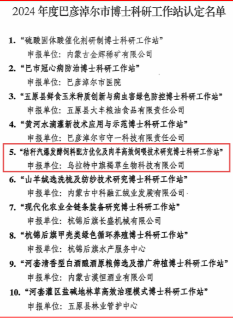 近日,巴彦淖尔市科学技术局官网发布《关于对2024年度巴彦淖尔市博士科研工作站拟认定名单公示的公告》,由乌拉特中旗农牧和科技局联合旗委组织部、旗人力资源和社会保障局共同推荐,乌拉特中旗褐草生物科技有限公司申报的“秸秆汽爆发酵饲料配方优化及肉羊高效饲喂技术研究博士科研工作站”成功获批,截至目前,乌拉特中旗获批的市级博士科研工作站共计7家。