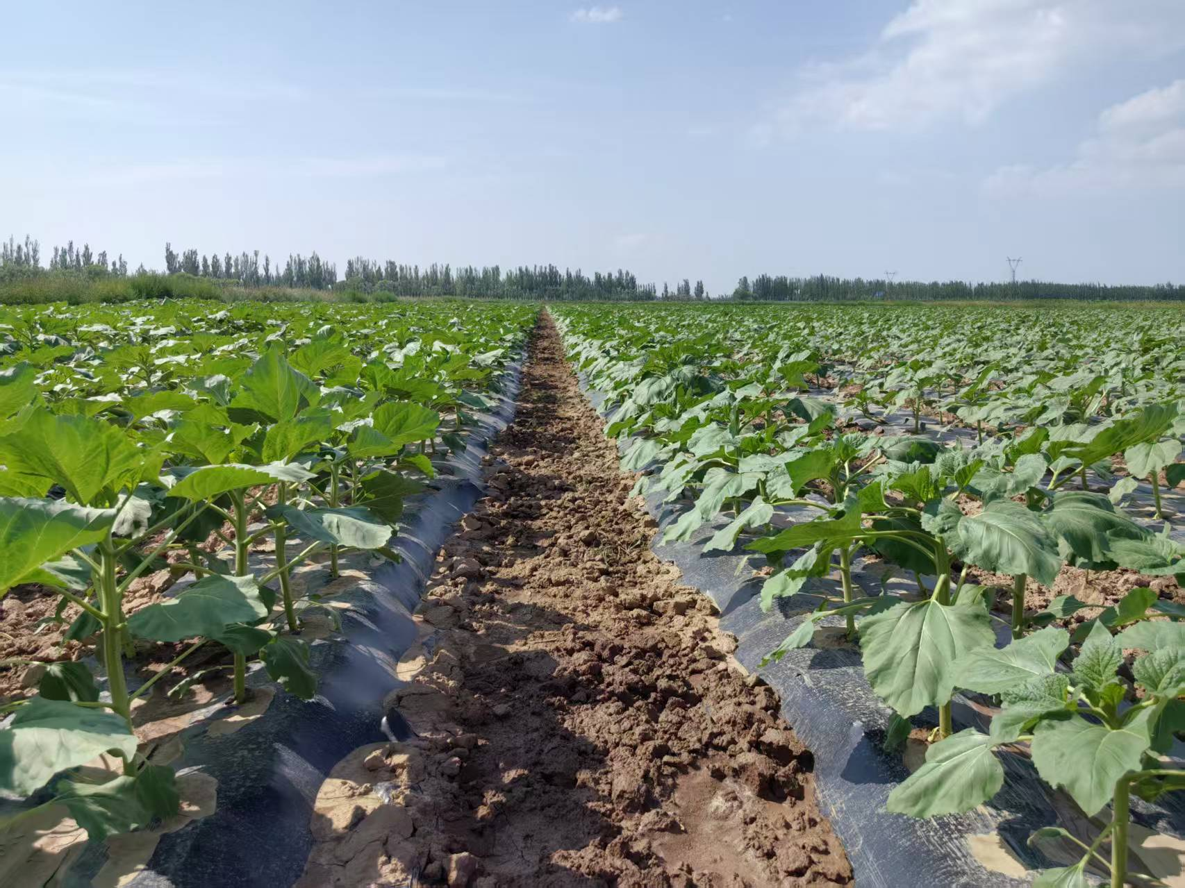 针对盐碱地种植向日葵“盐分表聚和暴雨积水烂根”等问题,高垄覆膜滴灌抑盐增产增效技术呈现出七大技术优势。一是盐碱地上的抑盐作用明显。通过起垄改变微地形,切断土壤反盐途径,结合生育期滴灌,有效淋洗耕层盐分,从而达到抑盐效果。二是提高向日葵出苗、保苗率。三是该模式向日葵通风透光效果好,在生长后期有很好的保墒效应,可有效促进向日葵地上部分干物质积累和地下根系横向和纵向生长,增加根系鲜重。四是可有效提高地温,提早向日葵成熟。五是增产效果显著。六是抗涝灾能力强。植株植于垄上,暴雨过后受灾程度轻,形成的垄沟排水效果明显。七是该模式配套旋耕起垄覆膜精良穴播机械,可以一次性完成起垄、施肥、覆膜、铺滴灌带、播种作业,大幅提升了播种效率,降低了生产成本。