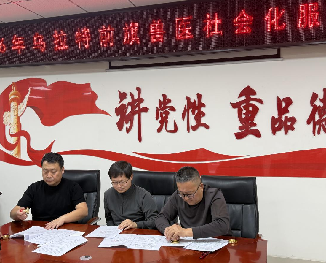 2月28日,乌拉特前旗农牧和科技局、动物疫病预防控制中心和内蒙古乌兰兽医技术有限公司,三方举行2026年兽医社会化服务项目签约仪式,标志着2026年乌拉特前旗动物防疫工作正式启航。