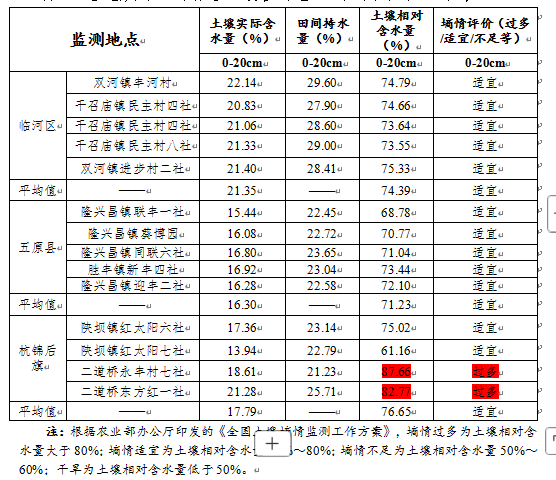 从墒情监测点土壤水分检测结果可以看出,临河区、五原县、杭锦后旗0-20cm土壤相对含水量分别为74.39%、71.23%、76.65%,我市土壤墒情整体适宜小麦播种,杭锦后旗部分区域墒情偏多,有潮塌风险。
