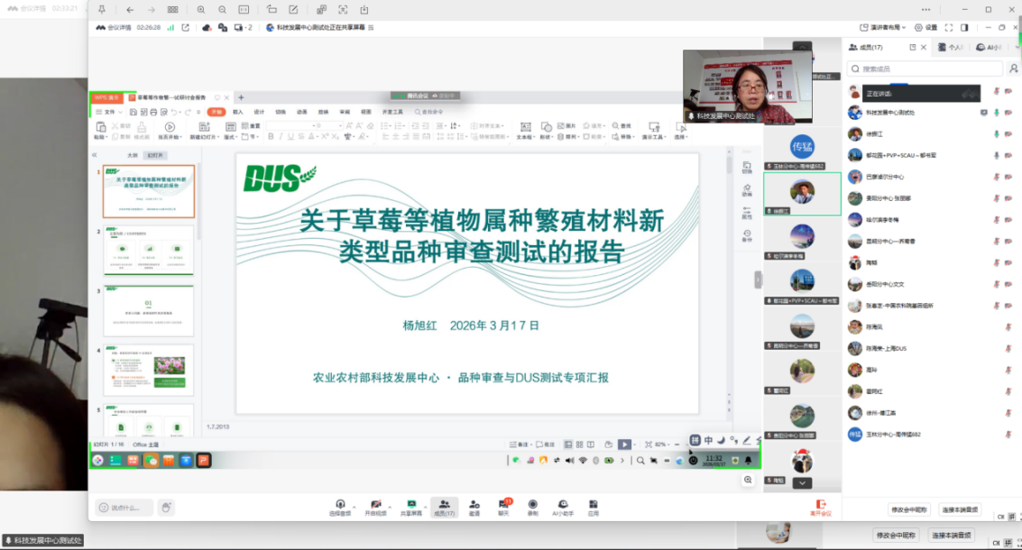 为提升我国品种审查与DUS测试工作的科学性与规范性,推动育种创新,农业农村部科技发展中心于3月17日线上组织召开了“草莓等作物繁殖材料新类型品种审查测试研讨会”。会议由农业农村部科技发展中心高级农艺师杨旭红主持,来自中国农科院、各测试分中心、高校、研究所及代理公司的二十余位专家参会。巴彦淖尔市农牧业科学研究所植物新品种测试中心刘春晖参加了本次会议。会议围绕新兴繁殖材料类型的DUS测试挑战与解决方案进行了深入研讨。