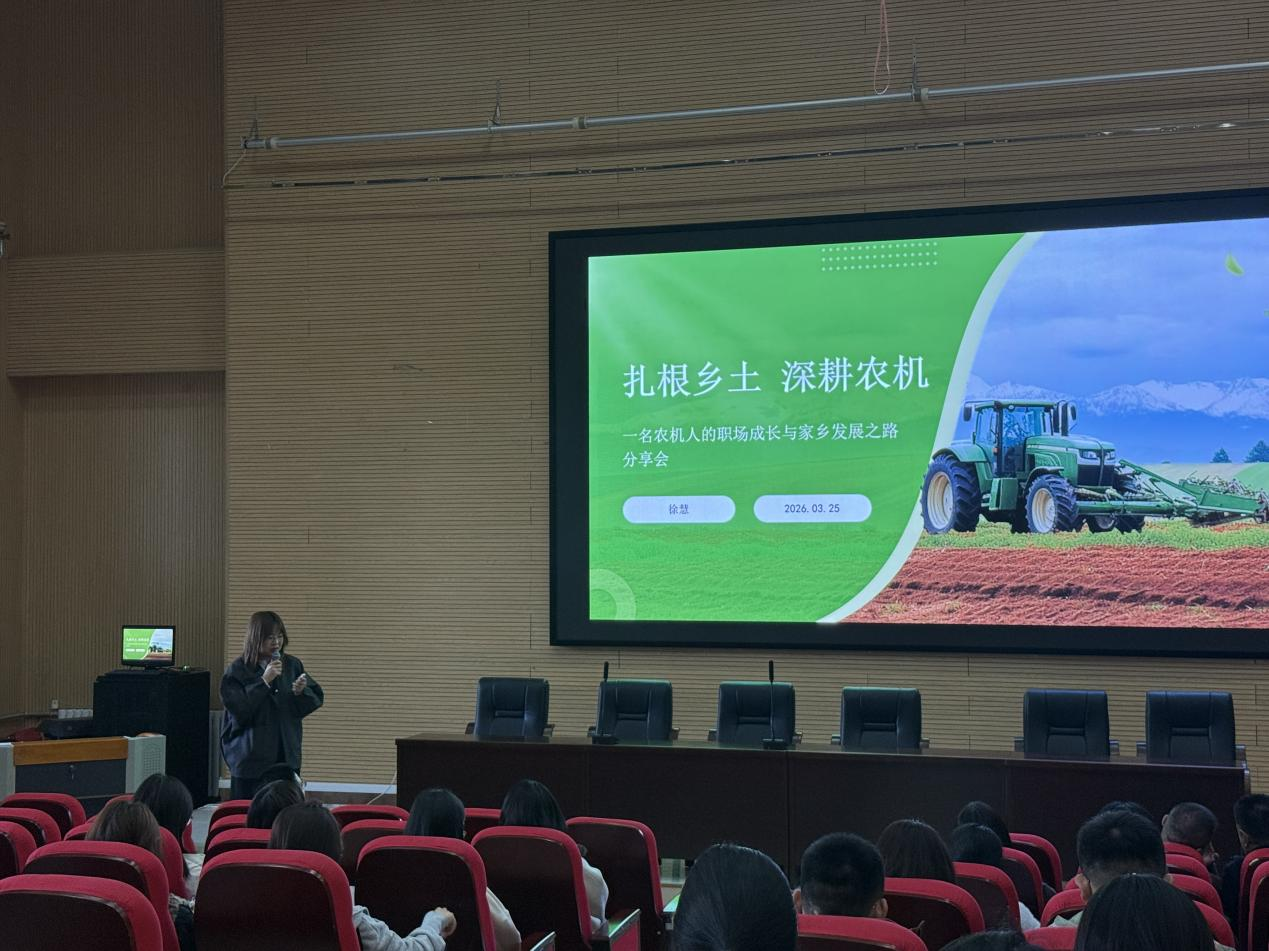 分享会上,讲师结合自身成长历程,深情讲述了从普通高校毕业生步入职场,一路拼搏成长为企业高管,最终怀揣对家乡的热爱,回归乡土深耕农机行业的蜕变之路,用亲身经历的职场故事、创业感悟,还原了农机行业发展的实践路径,也展现了返乡投身农牧事业的广阔前景。结合自身从业经验,讲师为在场学子提出四点恳切建议:一是跳出“大城市”迷思,认清乡土发展的无限潜力,摒弃盲目逐流的择业观念;二是深耕行业,拒绝浮躁心态,脚踏实地锤炼专业本领,筑牢职业发展根基;三是选择潜力中小企业,找准成长赛道,在实干中积累经验、实现价值;四是不负青春,勇敢选择,坚定投身农牧行业的信念,把个人理想融入家乡发展。整场分享内容真挚、干货满满,贴近大学生实际需求,引发在场师生强烈共鸣。